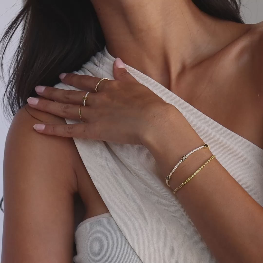 • Model showcases a dazzling, chic layering look featuring our Pave Oval Birthstone Ring, Lea Twisted Ring, Minimal Stacking Ring, and Classic Birthstone Tennis Bracelet