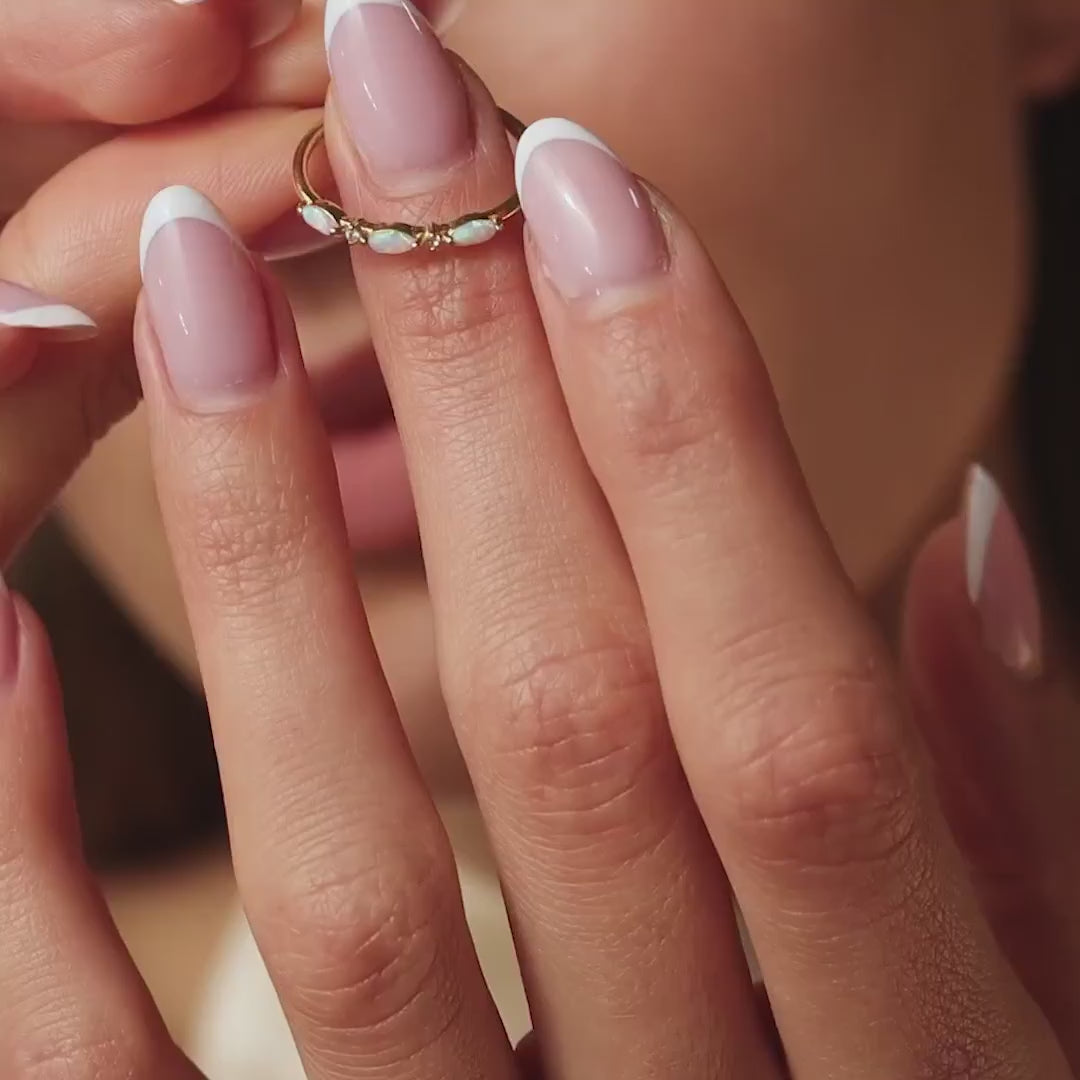Model showcases a a beautiful, iridescent ring stack featuring Alessia Trio Opal Ring, Everly Thin Duo Band and White Opal Inlay Band.